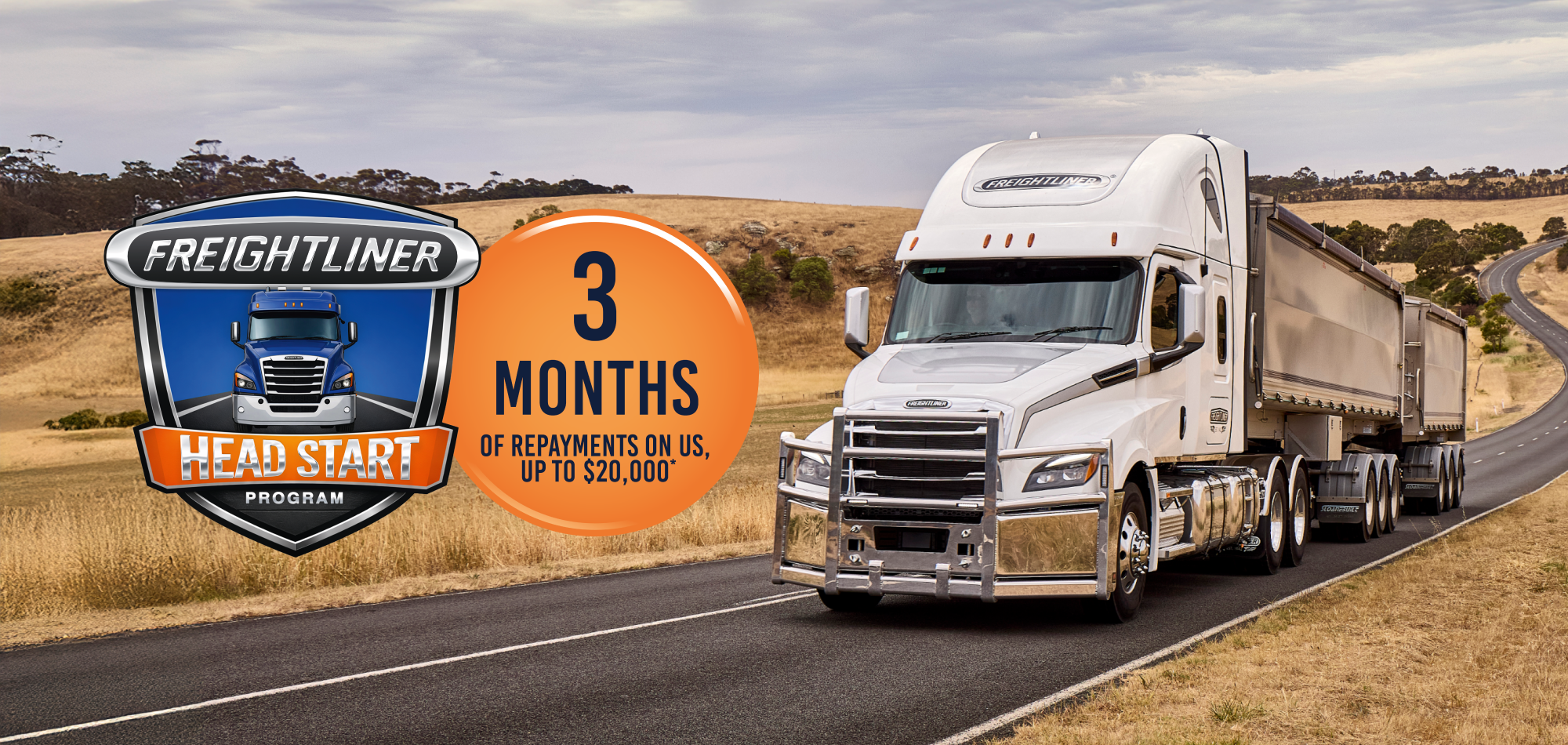 * Finance offer available on selected new & demo Freightliner trucks ordered between 18 March 2026 to 31 December 2026 (unless extended) and subject to stock and vehicle eligibility. Restricted to approved business customers (excluding fleet, government, or rental buyers) of Daimler Truck Financial Services Pty Ltd (“DTFSAu”) ABN 23 651 056 825 and subject to standard credit assessment and lending criteria, and fees may apply. A $20,000.00 finance contribution payable by Daimler Truck Australia Pacific Pty Ltd ABN 86 618 413 282 is available towards a new finance contract, structured as 3 equal payments for the first 3 months of the finance contract (i.e. exactly $ 6,666.66 per month). Following the 3 months, the customer returns to making repayments as per the relevant signed finance contract for the remainder of the term. Fast Track is also available in conjunction with this offer.